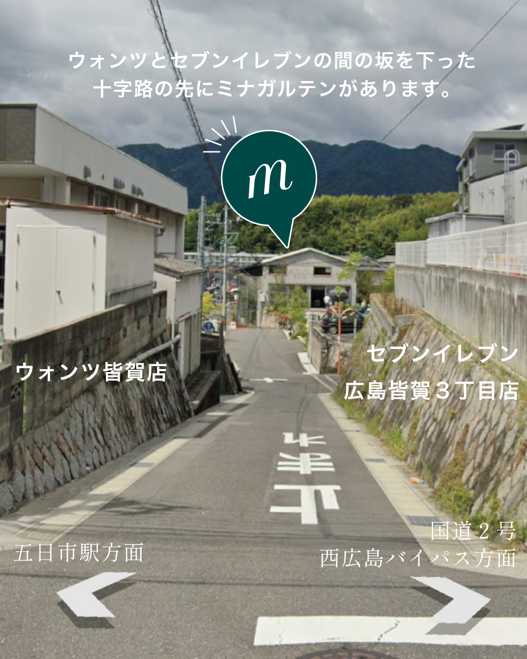 西広島バイパス(国道2号線)で広島市中心市街地から最寄り「皆賀ランプ」まで15~20分程度。「皆賀ランプ」降りてすぐ。